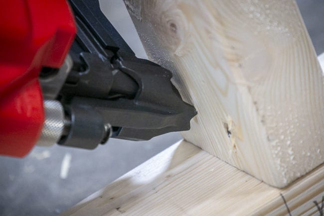 The Milwaukee M18 Fuel cordless framing nailer is a decent toe nailer. It fits between studs easily and getting an angle for the shot is easy enough. There’s pretty solid visibility around the nose as well.