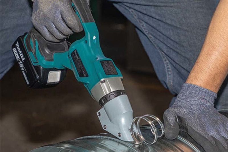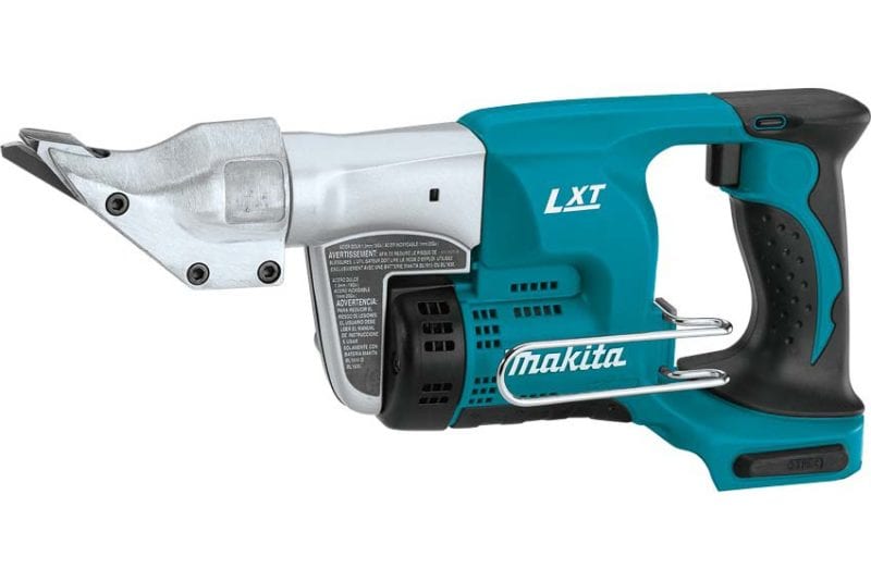 The cordless 18V Makita XSJ04 18V Offset Shear features a pistol grip and a trigger that can be locked to the on position. An aluminum housing keeps it durable and lightweight, while its LED light and belt clip give it a real “power drill” type of feel that lets you cut down to a 3″ inch radius.