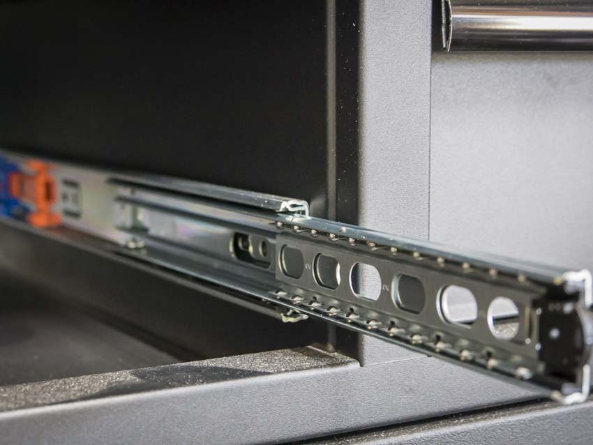 The drawers have a really nice soft-close feature. I’m often surprised why more toolboxes don’t feature this. If you’re not doing a positive handle lock, then soft-close is the way to go. It allows you to shut the drawers with some force while not tossing your tools all over the place. The mechanism then sucks the drawer in all the way without bouncing your tools. Our sockets and wrenches always end up in a mess at the back of the drawer.