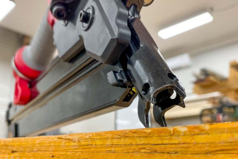 Toenailing into boards at hard angles can get tricky no matter what, and some nailers handle it better than others. This nailer underwent a bit of a facelift towards the business end to help improve performance in this area. The nose is now more aggressive with larger steel barbs that get a much better bite into the wood compared to other framers we’ve used in the past.