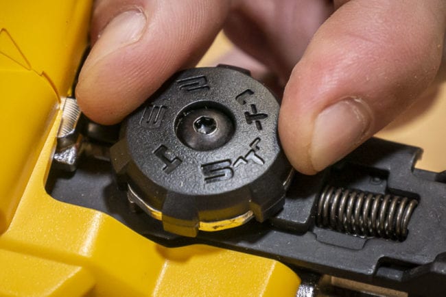 Getting into the job, I needed to set the right nail depth. The adjustment knob is on the top where it’s easy to access. There are 5 positions to click into and it’s easy to grip when you’re wearing gloves.