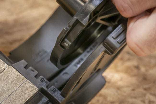 There are three magazine positions as well. To adjust it, rotate the tray out, push it to the level you want, and rotate it back in. Put your coil of up to 120 nails in and you’re ready to go.