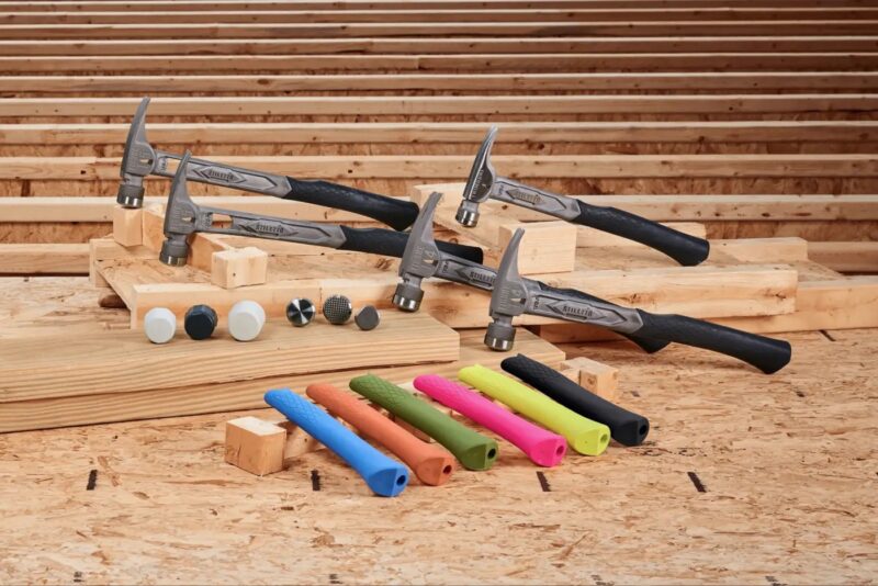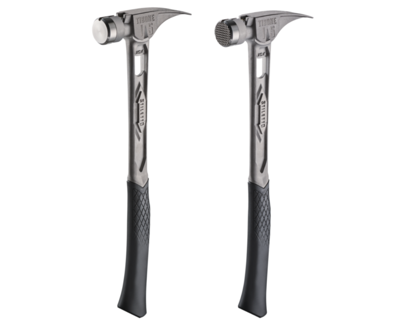 Stiletto tells us they fully redesigned the 14oz and 15oz TiBone titanium framing hammers to address some common pain points like premature breakage, worn grips, and misalignment. They feature improved handle durability, an anti-rotational face, and replaceable colored grips.