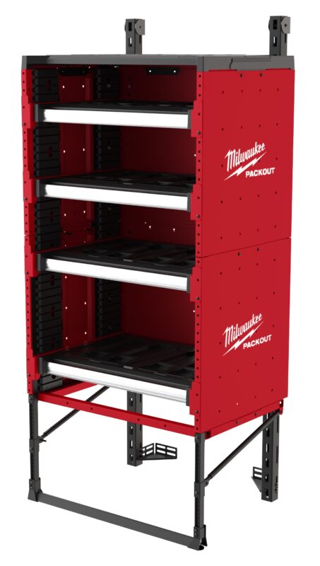 The new Packout Rack lets you connect all Packout Tool Boxes, Organizers, bags, and compatible power tools via the siding drawers. This gives you access to your storage without unstacking your Packout setup. The Packout Rack can also be installed in several box truck models, including Ford Transits, Ram ProMasters, and Mercedes Sprinters.