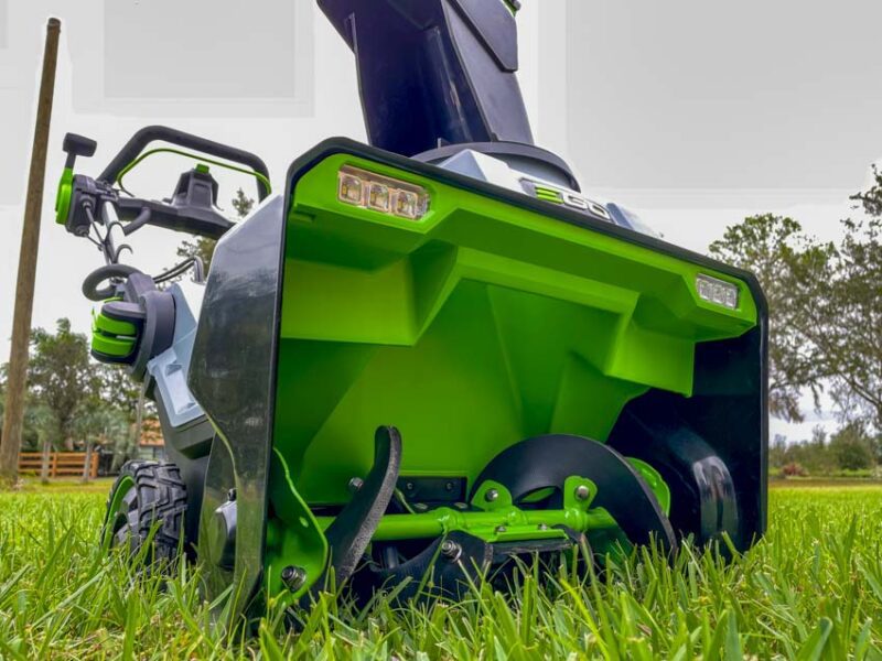 EGO also added a few helpful creature comforts to this snow blower. A pair of bright LED headlights cast about a 5-foot wide beam that can easily illuminate a dark sidewalk or driveway if you’re working in low- or no-light conditions. Turn them on or off with a simple button press on the control deck.