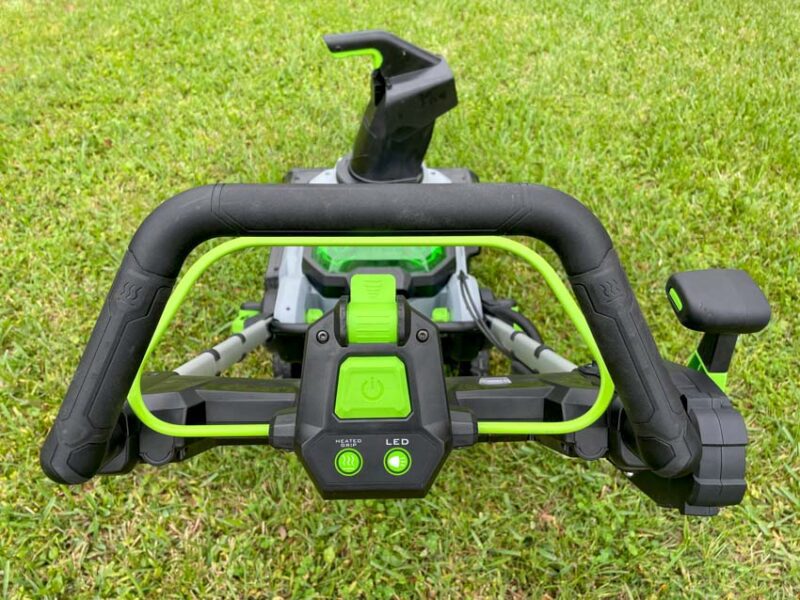 The control center and start-up procedure for this snow blower are pretty similar to that of EGO’s cordless mowers. To get started, press and hold the large power button and then pull down on the presence bar to activate the heavy-duty rubber auger.