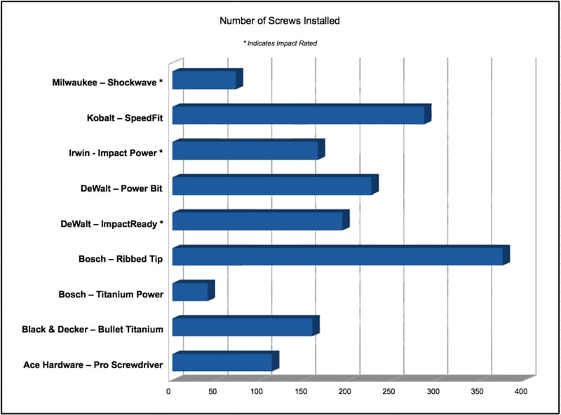 By using this breakdown you can easily analyze two things: the best value and the toughest (cost-no-option) bit. The Bosch Titanium Power Bit was the third most expensive bit in the line-up and it was only able to install 40 screws. This is in stark contrast to the lowly Kobalt SpeedFit bits that were the least expensive and gave the second best performance. Ironically, the largest quantities of screws were put in by the three least expensive bits in the line-up. The only impact rated bit that consistently had a decent number of installed fasteners was DeWalt’s ImpactReady model. Even considering that, this should be your hint that it is OK to save some dough and go cheap on your bits.