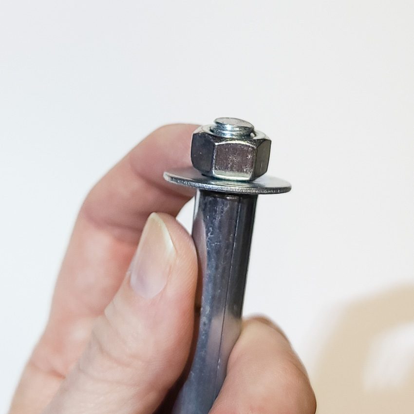 Once the hole is drilled and the anchor is inserted as far as it will go, drive the anchor in the rest of the way with a hammer or small sledgehammer, depending on the size anchor you are using. Be very careful here. Notice the photos below. There are two types of concrete wedge and sleeve anchors. High-quality premium brands have extra metal at the top of the bolt so you don’t deform the screw threads when hammering it in. If you use the cheap anchors, back off the nut so you will not be hammering on the end of the bolt. You want to be hammering on the nut instead and it will protect the threads (see the photo on the far right). Don’t use excessive force regardless.
